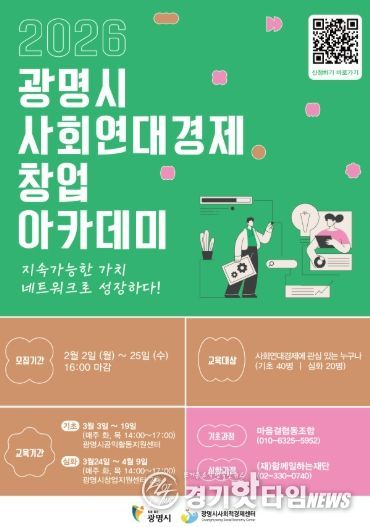 [경기핫타임뉴스=김삼영 기자] 광명시가 ‘2026년 광명시 사회연대경제 창업 아카데미’ 수강생을 오는 25일까지 모집한다.