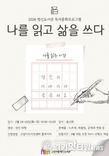 [경기핫타임뉴스=김형철 기자] 고양특례시 행신도서관은 일반 성인을 대상으로 하는 글쓰기 프로그램 ‘나를 읽고 삶을 쓰다’를 운영한다.