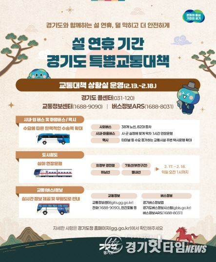 [경기핫타임뉴스=김삼영 기자] 경기도가 안전하고 편한 설 귀성길 조성을 위해 13일부터 18일까지 6일간을 ‘2026년도 설 연휴 특별교통대책기간’으로 정하고 시외버스 증차, 도로정보 실시간 안내, 긴급도로 복구 체계 구축 등 적극 대응한다.
