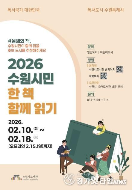 [경기핫타임뉴스=김삼영 기자] 수원시도서관이 ‘2026 수원시민 한 책 함께 읽기’ 올해의 책 후보 도서를 2월 18일까지 추천받는다. 수원시민 누구나 추천할 수 있다.
