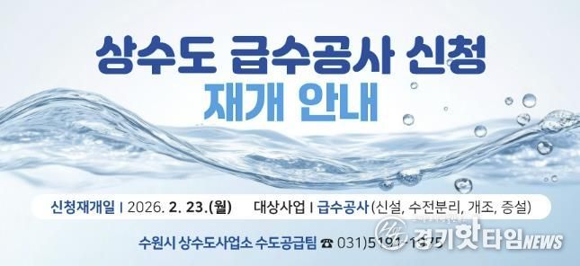 [경기핫타임뉴스=김삼영 기자] 수원시상수도사업소가 겨울철 기온 강하로 인한 부실 공사 등을 예방하기 위해 중단했던 상수도 급수공사 신청을 2월 23일부터 재개한다.