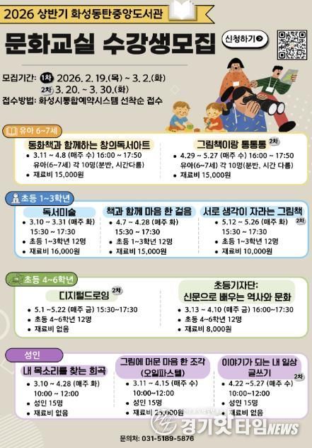 [경기핫타임뉴스=김삼영 기자] 화성특례시는 지난해 11월 3일 개관한 화성동탄중앙도서관에서 시민들이 다양한 독서·문화 활동을 즐길 수 있도록 2026년 상반기 문화교실 프로그램을 운영한다고 밝혔다.