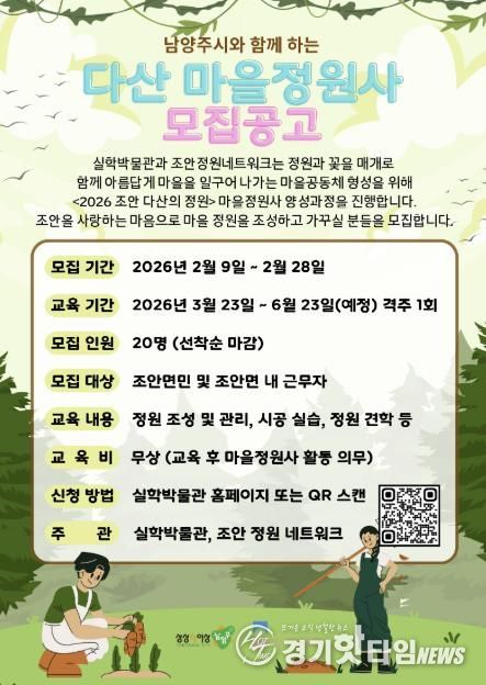 교육을 진행하는 조안정원네트워크 배호영 대표는 서울시 조경과장으로 서울숲과 월드컵공원 조성을 이끈 전문가다. 은퇴 후에는 남양주시 조안면에서 이로가든스쿨을 운영하며 정원문화 확산을 위한 활동을 이어오고 있다. 배 대표는 “실학박물관의 지역 연계가 단순한 의견 수렴에 머물지 않고, 마을정원사 양성과 커뮤니티 정원 조성이라는 실제 사업으로 이어져 매우 뜻깊다”며 “정원과 꽃을 매개로 이웃과 함께 아름다운 마을을 일구어 갈 분들의 참여를 환영한다”고 말했다.