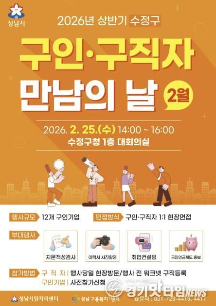 [경기핫타임뉴스=김삼영 기자] 성남시는 시민의 취업을 지원하고 지역 기업의 인력난 해소를 위해 오는 2월 25일 오후 2시부터 4시까지 수정구청 1층 대회의실에서 ‘구인·구직자 만남의 날’ 행사를 연다.