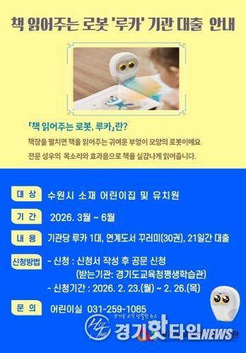 [경기핫타임뉴스=김삼영 기자] 경기도교육청평생학습관이 수원시 소재 어린이집과 유치원을 대상으로 책 읽어주는 로봇 ‘루카(Luka)’와 ‘연계도서 꾸러미’ 대출 서비스를 운영한다.