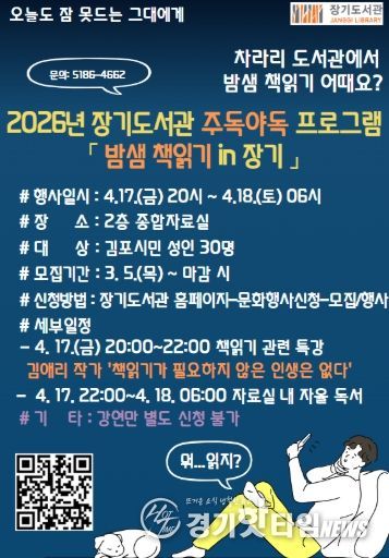 [경기핫타임뉴스=김형철 기자] 김포시 장기도서관은 시민들이 책과 함께 특별한 밤을 보낼 수 있도록 오는 4월 17일 오후 8시부터 다음날인 4월 18일 오전 6시까지 도서관에서 자율적으로 독서를 하는 '밤샘 책읽기 인(in) 장기' 프로그램을 진행한다.
