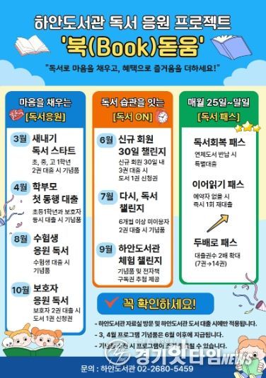 김광용 하안도서관장은 “이번 북돋움 프로젝트는 단발성 행사가 아닌 연중 지속적인 운영으로 시민들이 독서 응원을 받고 일상 속에 도서관이 스며드는 계기가 될 것”이라며 “많은 시민이 자연스럽게 도서관을 찾고 마음의 위로를 얻으며 독서의 가치를 재발견하길 바란다”고 말했다.