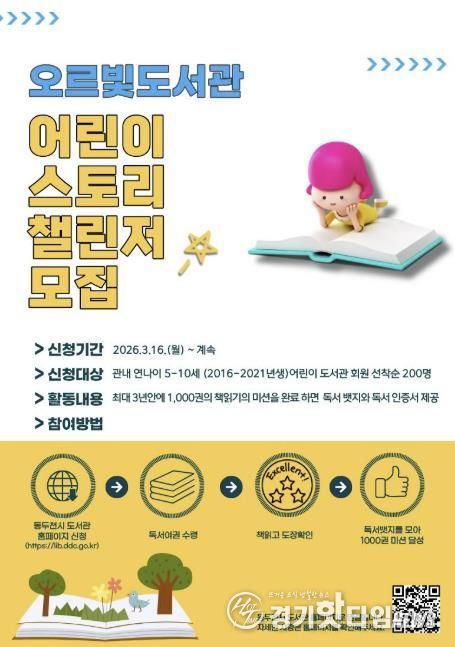 [경기핫타임뉴스=김형철 기자] 동두천시 도서문화사업소는 3월 16일부터 관내 5-10세 어린이를 대상으로 ‘어린이 스토리 챌린저’ 참여자를 모집한다고 밝혔다. 이번 사업은 어린이의 자발적인 독서 습관 형성과 ‘책 읽는 동두천’ 분위기 조성 및 독서문화 확산을 위해 마련했다.