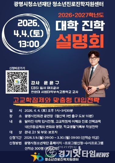 [경기핫타임뉴스=김삼영 기자] 광명시청소년재단 청소년진로진학지원센터는 오는 4월 4일 광명시민회관 공연장에서 '고교학점제 시대와 맞춤형 대입전략'을 주제로 2026·2027학년도 대학진학 설명회를 개최한다.