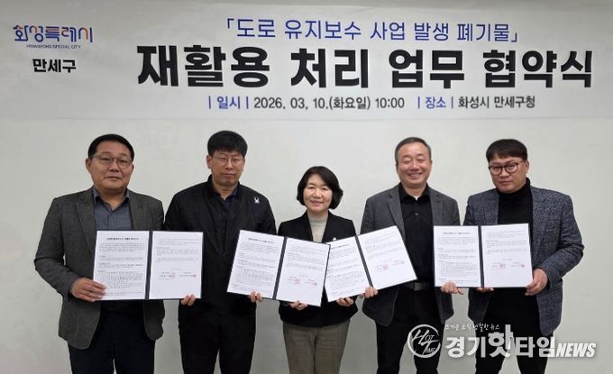 [경기핫타임뉴스=김삼영 기자] 화성특례시 만세구가 도로 유지보수 과정에서 발생하는 폐기물을 효율적으로 처리하고 자원 재활용을 확대하기 위해 관내 아스콘 생산 업체와 ‘폐아스콘 재활용 처리 협약’을 체결했다.