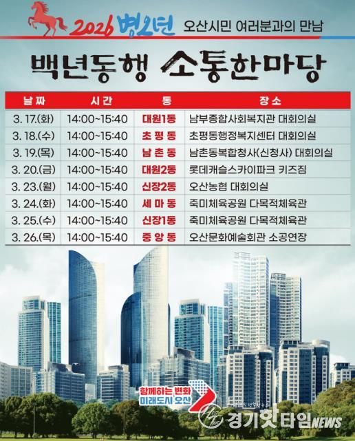 [경기핫타임뉴스=김삼영 기자] 오산시가 시민과 직접 만나 시정 운영 방향을 공유하고 지역 현안을 듣는 ‘2026 백년동행 소통한마당’을 개최한다.