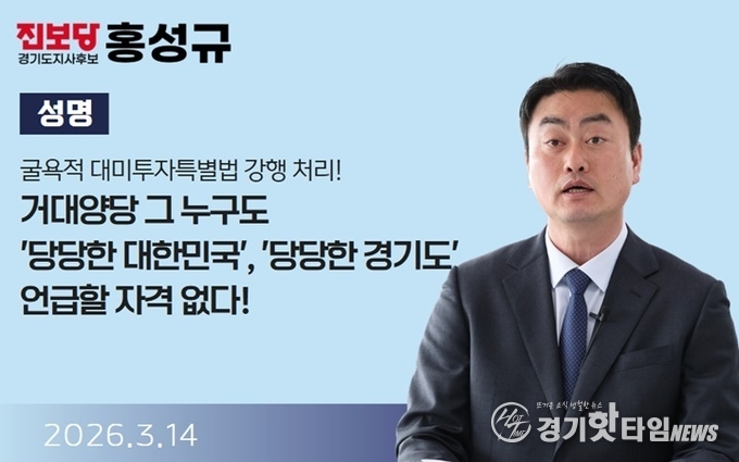 [경기핫타임뉴스=김삼영 기자] 홍성규 진보당 경기도지사 후보는 14일 성명을 내고, "굴욕적 특별법 강행 처리한 거대양당 그 누구도 '당당한 대한민국', '당당한 경기도' 언급할 자격이 없다"고 일갈했다.