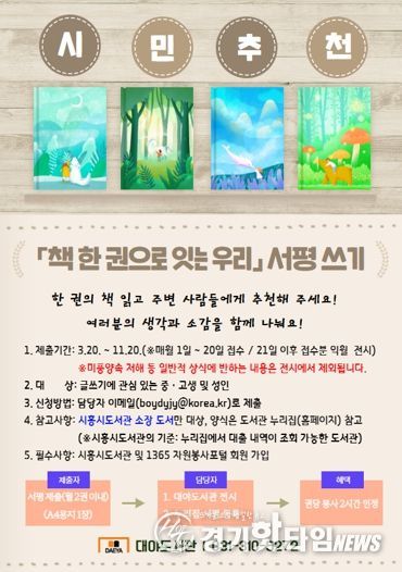 [경기핫타임뉴스=김삼영 기자] 시흥시 대야도서관은 시민 독서 문화 확산과 지역사회 독서공동체 활성화를 위해 3월 20일부터 11월 20일까지 서평 쓰기를 운영하는 가운데 시민들의 서평을 받는다.