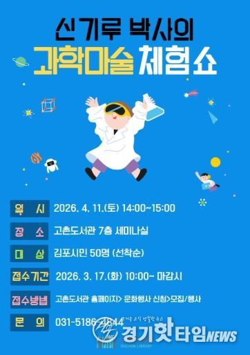 [경기핫타임뉴스=김형철 기자] 김포시 고촌도서관은 4월 11일 오후 2시 초등학생 3~6학년을 대상으로 '신기루 박사의 과학마술 체험쇼'를 운영한다.