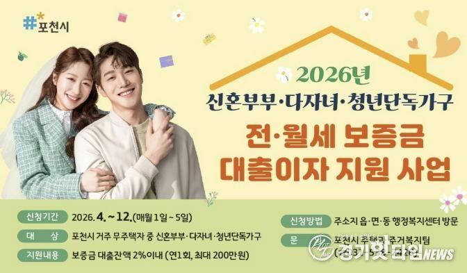 [경기핫타임뉴스=김형철 기자] 포천시는 ‘2026년 신혼부부·다자녀·청년가구 전월세 보증금 대출이자 지원사업’을 추진한다.