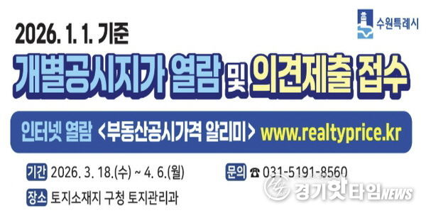 [경기핫타임뉴스=김삼영 기자] 수원시 영통구는 3월 18일부터 4월 8일까지 20일간 2026년 1월 1일 기준 개별공시지가에 대한 열람을 실시하고 토지소유자 및 이해관계인의 의견을 접수한다.