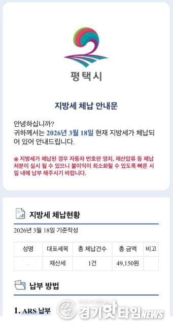 [경기핫타임뉴스=김삼영 기자] 평택시는 ‘모바일 전자고지 시스템’을 활용해 지방세 체납자 1만7천여 명을 대상으로 오는 23일과 24일 이틀 동안 전자문서 형태의 체납안내문을 발송할 예정이다.