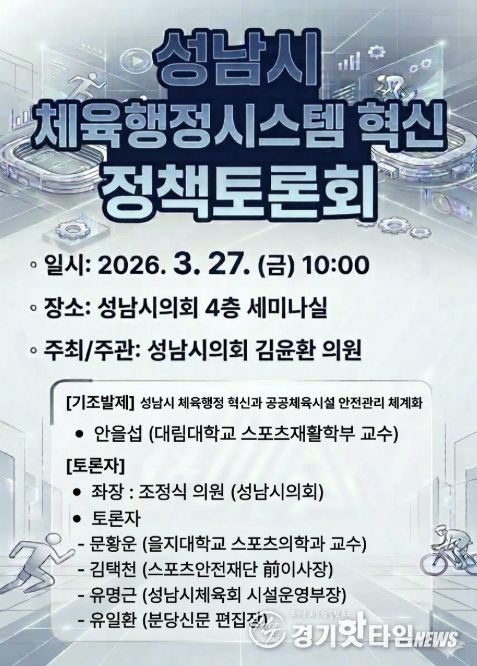 [경기핫타임뉴스=김삼영 기자] 성남시의회 김윤환 의원(문화복지체육위원회)은 오는 27일, 성남시 체육행정의 혁신 방향을 모색하기 위한 '성남시 체육행정시스템 혁신 정책토론회'를 개최한다고 밝혔다.