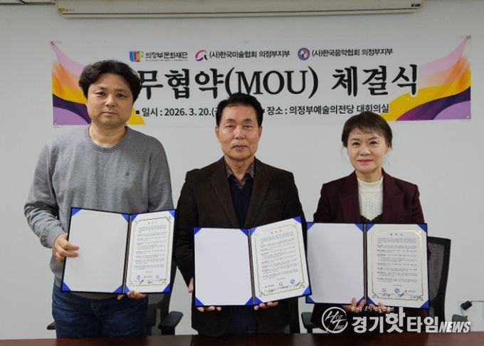 [경기핫타임뉴스=김형철 기자] (재)의정부문화재단과 (사)한국미술협회 의정부지부, (사)한국음악협회 의정부지부는 2026년 지역 문화예술 발전과 상호 협력 강화를 위한 3자 간 업무협약(MOU)을 체결했다.