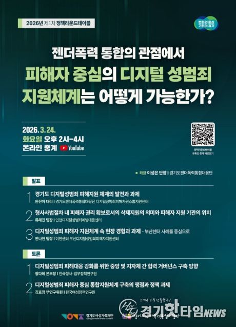 [경기핫타임뉴스=김삼영 기자] 경기도와 경기도젠더폭력통합대응단은 24일 오후 2시 ‘젠더폭력 통합의 관점에서 피해자 중심의 디지털 성범죄 지원체계는 어떻게 가능한가?’라는 주제로 2026년 제1차 정책라운드테이블을 개최한다.