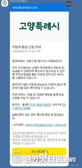 [경기핫타임뉴스=김형철 기자] 고양특례시 덕양구는 23일 오늘 지방세 환급금을 수령하지 않은 납세자를 대상으로 카카오 알림톡(채널명: 덕양구지방세환급)을 발송해 환급금 조회 및 신청 방법을 안내할 예정이다.
