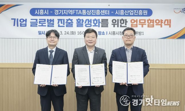 [경기핫타임뉴스=김삼영 기자] 시흥시는 지난 3월 24일 시청 혁신토론방에서 경기지역FTA통상진흥센터, 시흥산업진흥원과 관내 중소기업의 수출 확대와 글로벌 진출 지원을 위한 업무협약을 맺었다.
