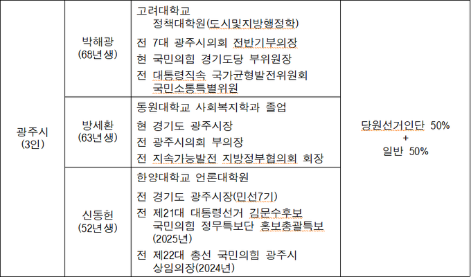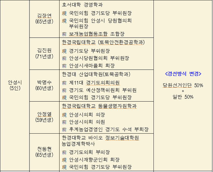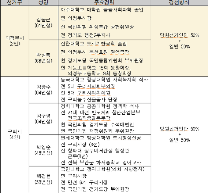[경기핫타임뉴스=김삼영 기자] 국민의힘 경기도당 공천관리위원회(이하 공관위)는 지난 발표에서 빠졌던 기초단체장 선거구 5곳(의정부시, 구리시, 광주시, 연천군, 가평군)에 대해 경선 대상자와 방식을 결정했고 기존에 발표했던 안성시의 경선방식을 변경했다.