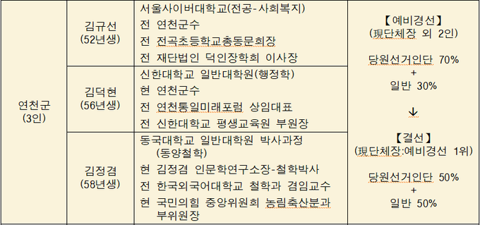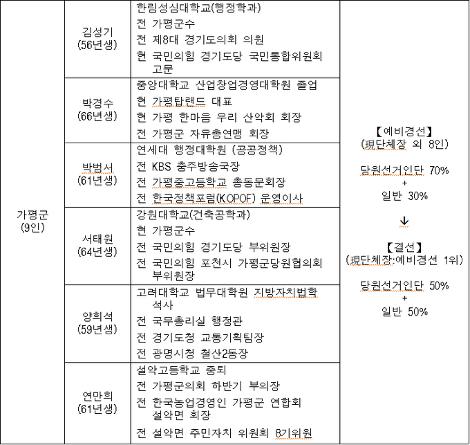기초자치단체장 경선 선거구 및 대상 선정 결과