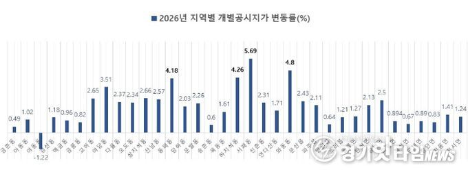 지역별 상승률은 메디컬클러스터 등 개발 수요의 영향으로 운정지역 서패동 5.69%, 와동동 4.8%, 하지석동 4.26%, 동패동 4.18%로 다소 높게 나타났다. 개별토지 기준 최고 지가는 금촌동 54-27번지 상업용지가 제곱미터(㎡)당 5,765,000원, 와동동 1472-1번지 중심상업용지가 제곱미터(㎡)당 5,243,000원으로 확인됐다.