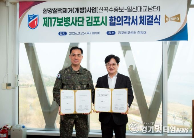 [경기핫타임뉴스=김형철 기자] 김포시가 54년만에 신곡수중보~일산대교 한강 철책을 철거한다. 시는 26일 육군 제2291부대와 신곡수중보부터 일산대교 남단까지 한강변 경계철책 철거 구간에 대한 수정 합의각서를 체결했다고 밝혔다. 이는 지난해 10월 백마도 개방 및 철책철거 합의각서 체결에 이어 이번 구간까지 철거 범위를 넓힌 성과로, 김포시는 백마도(김포대교)부터 일산대교까지 철책을 제거할 수 있게 됐다.