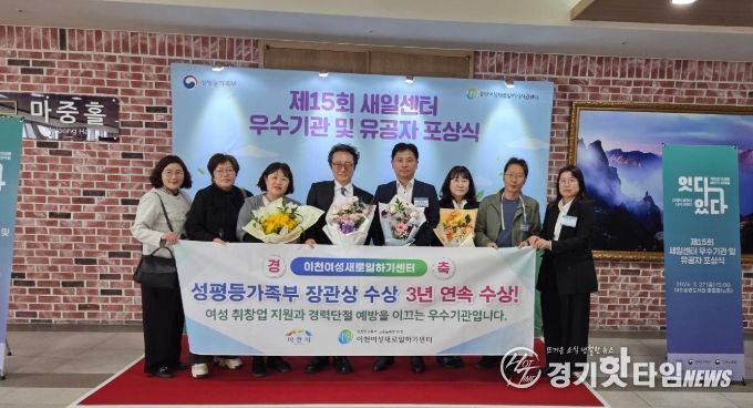 [경기핫타임뉴스=김형철 기자] 이천여성새로일하기센터(이하 이천새일센터)가 3월 27일 서울 마포중앙도서관에서 열린 ‘2026년 여성새로일하기센터 유공 포상식’에서 우수기관 및 종사자, 우수기업, 우수사례 등 4개 부문에서 성평등가족부 장관상을 수상했다.