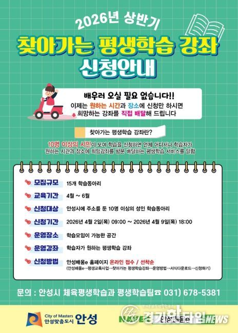 [경기핫타임뉴스=김삼영 기자] 안성시는 시민이 원하는 시간과 장소에서 희망하는 강좌를 수강할 수 있는 '2026년 상반기 찾아가는 평생학습 강좌'를 운영한다고 밝혔다.
