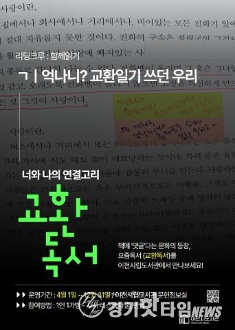 [경기핫타임뉴스=김형철 기자] 이천시립도서관은 시민들이 서로 소통하며 즐겁게 책을 접할 수 있도록, 오는 4월 1일부터 12월 31일까지 시립도서관 문헌정보실에서 ‘리딩크루’ 사업의 일환인 ‘교환독서’ 프로그램을 운영한다.