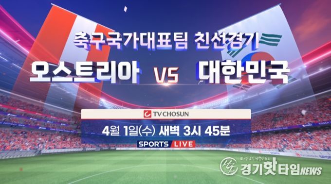[경기핫타임뉴스=김삼영 기자] '대한민국 축구대표팀 경기 주관 방송사'인 TV CHOSUN이 4월 1일(수) 새벽 3시 45분부터 축구 국가대표팀 친선경기 '대한민국 vs 오스트리아'를 생중계한다.
