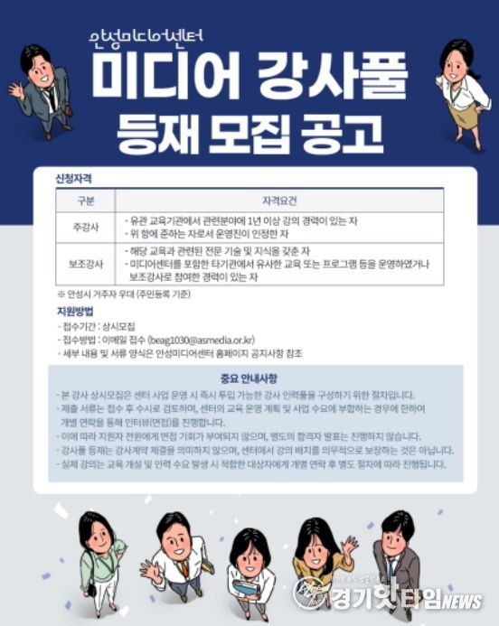 [경기핫타임뉴스=김삼영 기자] 안성시는 4월 1일부터 보다 체계적이고 전문적인 미디어 교육 운영을 위해 ‘미디어 강사풀’ 등재 강사를 상시 모집한다.