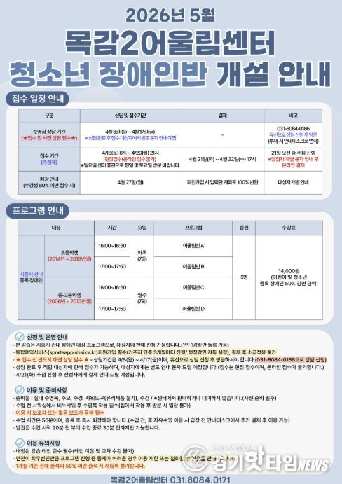 프로그램 접수는 4월 18일 6시부터 4월 20일 21시까지 현장 접수를 진행하고, 4월 21일 당첨자에게 개별 안내할 예정이다. 궁금한 사항은 목감2어울림센터로 문의하면 된다.