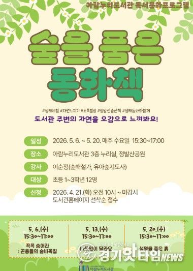[경기핫타임뉴스=김형철 기자] 고양특례시 아람누리도서관이 오는 5월, 어린이들이 책 속 이야기를 자연 현장에서 직접 체험하며 생태 감수성을 키우는 독서문화 프로그램 ‘숲을 품은 동화책’을 운영한다.