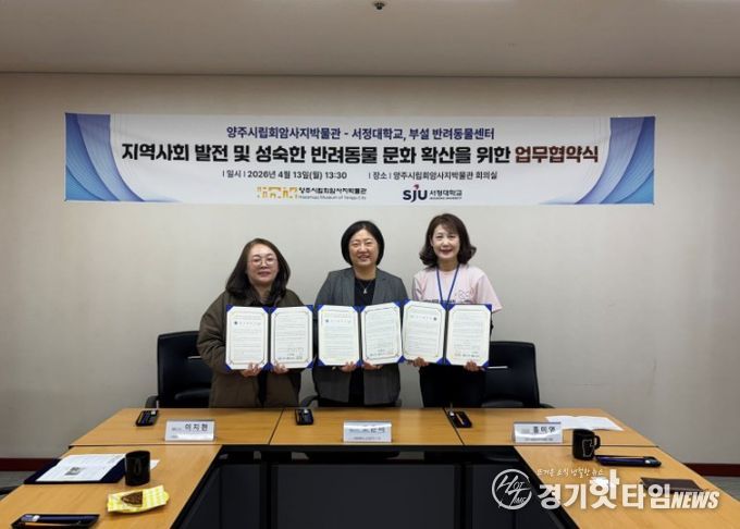 [경기핫타임뉴스=김형철 기자] 양주시립회암사지박물관은 서정대학교 및 서정대학교 부설 반려동물센터와 지난 13일 지역사회 발전과 성숙한 반려동물 문화 조성을 위한 업무협약(MOU)을 체결했다고 밝혔다.
