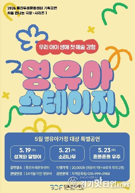 [경기핫타임뉴스=김형철 기자] 김포문화재단은 오는 5월 가정의 달을 맞아 통진두레문화센터 특별 기획으로 24개월 미만 영유아를 위한 체험형 공연 시리즈 '처음 만나는 극장 - 영유아 스테이지'를 선보인다.