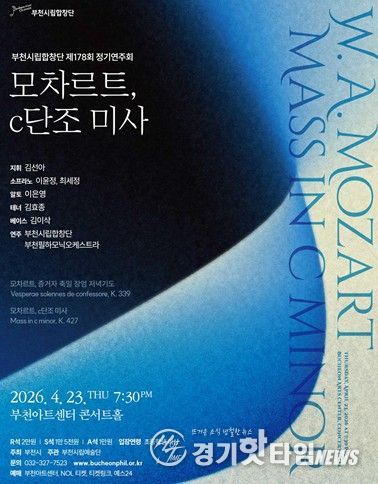 [경기핫타임뉴스=김형철 기자] 부천시립합창단이 오는 4월 23일 오후 7시 30분 부천아트센터 콘서트홀에서 제178회 정기연주회 ‘모차르트, c단조 미사’를 개최한다. 이번 공연은 김선아 상임지휘자의 지휘 아래 소프라노 이윤정, 최세정, 알토 이은영, 테너 김효종, 베이스 김이삭이 협연자로 무대에 오르며, 부천시립합창단과 부천필하모닉오케스트라, 구민아(오르간)가 함께한다.