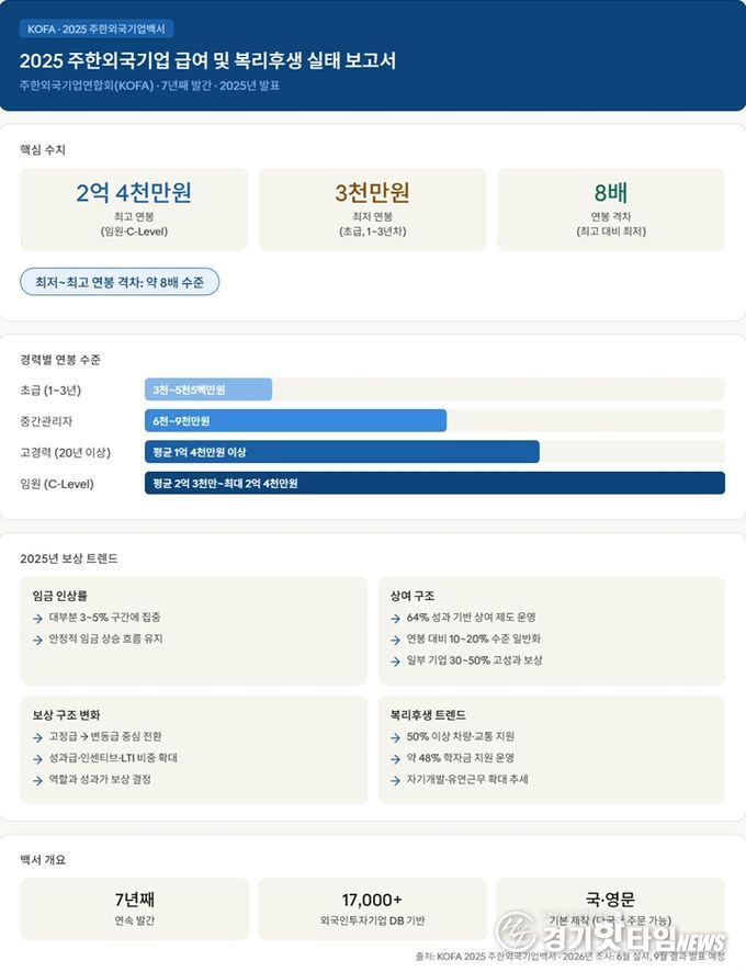 [경기핫타임뉴스=김형철 기자] 주한외국기업연합회(상임대표 김종철, KOFA)는 ‘2025 주한외국기업백서’ 혁신판을 발표하고, 작년 6월 실시한 주한외국기업 급여 및 상여금 실태조사와 함께 복리후생 조사 결과를 포함해 공개했다. 이번 백서는 7년째 발간되는 자료로, 기존 조사 대비 한층 고도화된 분석 체계를 적용해 글로벌 전문 조사기관 수준의 HR 리포트로 업그레이드됐다는 평가를 받고 있다.