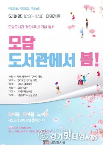 [경기핫타임뉴스=김형철 기자] 김포 최대 규모 공공도서관인 모담도서관이 개관 1주년을 맞아 오는 5월 10일 ‘책과 문화·예술·놀이’가 어우러지는 행사를 연다. 이번 행사는 시민들에게 감사의 마음을 전하고 복합문화공간으로서의 역할을 수행하고자 마련된 것으로, 사전예약 없이 도서관 방문자 누구나 참여 가능하다.