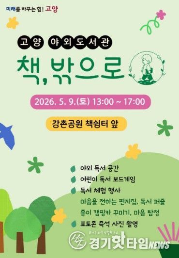 [경기핫타임뉴스=김형철 기자] 고양특례시는 오는 5월 9일 오후 1시부터 5시까지 일산동구 강촌공원 책쉼터 앞에서 고양 야외도서관 ‘책, 밖으로’를 운영한다.