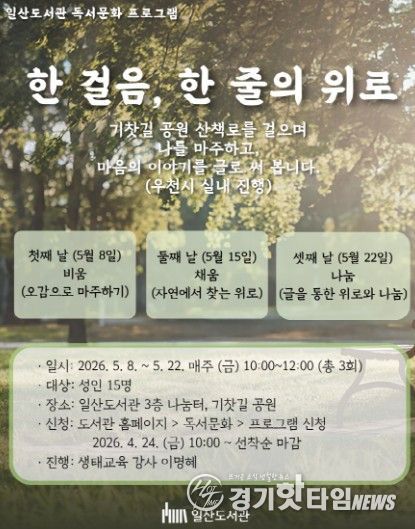일산도서관 관계자는 “‘한 걸음, 한 줄의 위로’는 자연 속에서 천천히 걷고 글로 자신을 표현하는 과정을 통해 스스로를 돌보고 치유하는 프로그램”이라며, “참여자들이 서로의 이야기를 나누며 공감과 위로를 경험하는 시간이 되길 바란다”고 전했다.