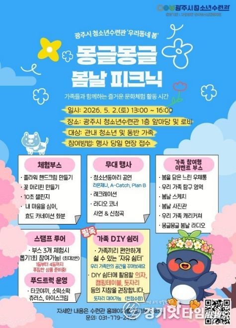 [경기핫타임뉴스=김삼영 기자] 광주시 청소년수련관은 오는 5월 2일 오후 1시부터 수련관 1층 앞마당 및 로비에서 ‘2026년 우리동네 봄 몽글몽글 봄날 소풍’을 개최한다고 23일 밝혔다.