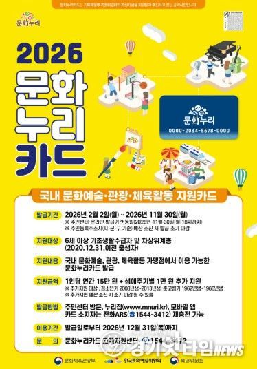 한편, 문화누리카드는 각 동 행정복지센터, 문화누리카드 누리집, 모바일 앱 등을 통해 오는 11월 30일까지 선착순 발급되며, 12월 31일까지 사용하지 않으면 자동 소멸한다.
