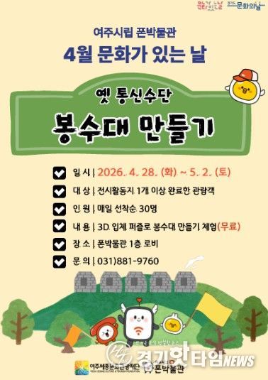 [경기핫타임뉴스=김형철 기자] 여주세종문화관광재단이 운영하는 여주시립 폰박물관은 4월 '문화가 있는 날'을 맞아 오는 4월 28일부터 5월 2일까지 시민 참여형 체험 행사 '소식을 전하던 봉수대 만들기'를 운영한다.