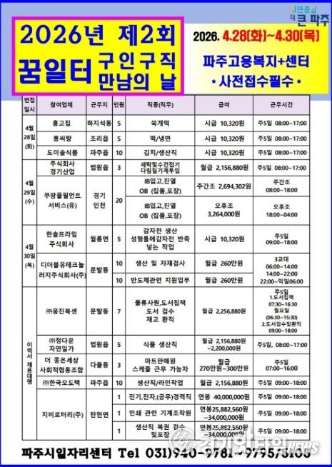 [경기핫타임뉴스=김형철 기자] 파주시는 오는 28일부터 30일까지 파주고용복지플러스센터(금촌동 엠에이치(MH)타워 8층)에서 2026년 제2회 ‘구인·구직 만남의 날’을 개최한다.