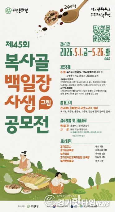[경기핫타임뉴스=김형철 기자] 부천문화원이 설립 60주년을 기념하여 지역 문화의 가치를 시민과 공유하고 향토문화의 지속가능한 기반을 마련하기 위한 ‘제45회 복사골 백일장·사생(그림) 공모전’을 개최한다. 이번 공모전은 지난 60년간 지역 문화의 구심점 역할을 해온 부천문화원의 역사를 되짚어보고, 국민의 참여를 통해 지역 공동체의 유대감을 강화하고자 기획됐다.