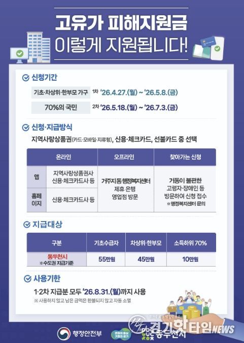 [경기핫타임뉴스=김형철 기자] 동두천시가 중동발 고유가와 고물가로 인한 시민 부담을 완화하고 지역경제 회복을 지원하기 위해 ‘고유가 피해지원금’을 지급한다.